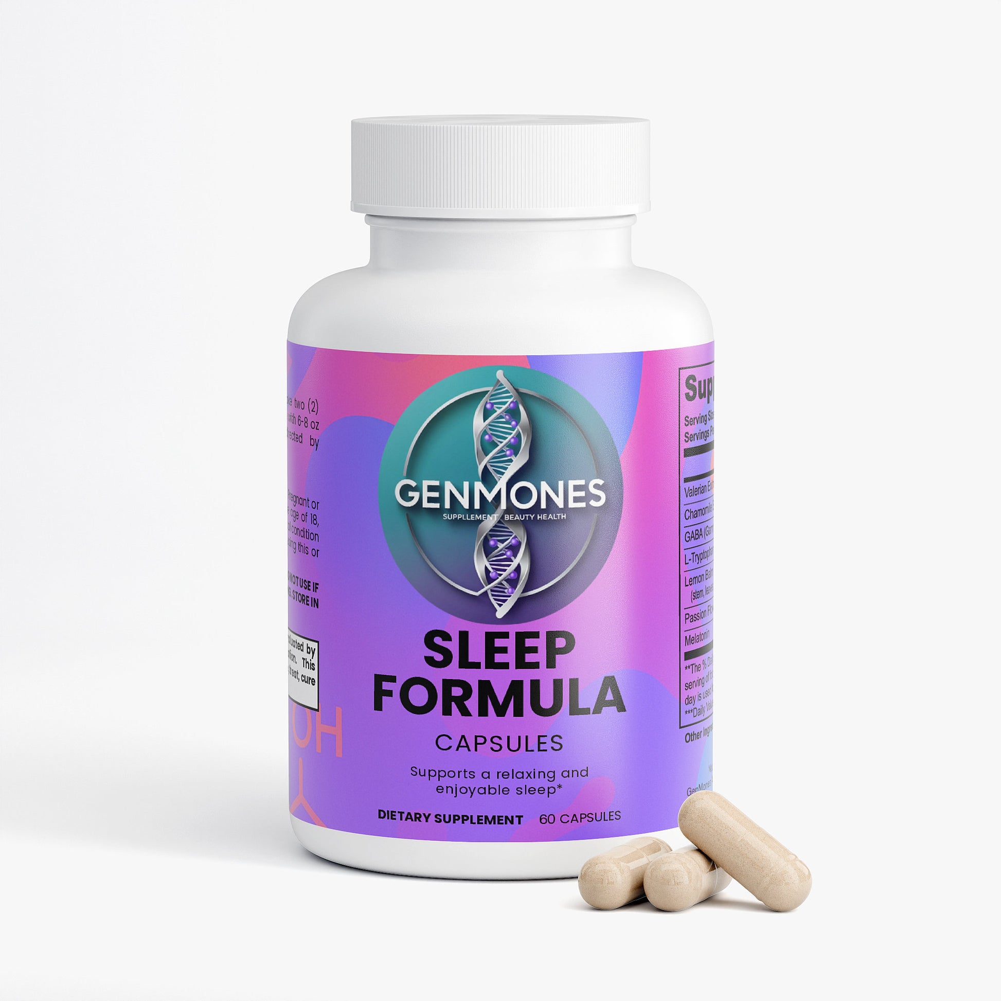 Ingredients: Valerian Extract (root); Chamomile Extract (flower); GABA (Gamma-Aminobutyric Acid); L-Tryptophan; Lemon Balm Extract (Melissa officinalis) (stem, leaves, flower); Passion Flower Extract (stem, leaves, flower); Melatonin